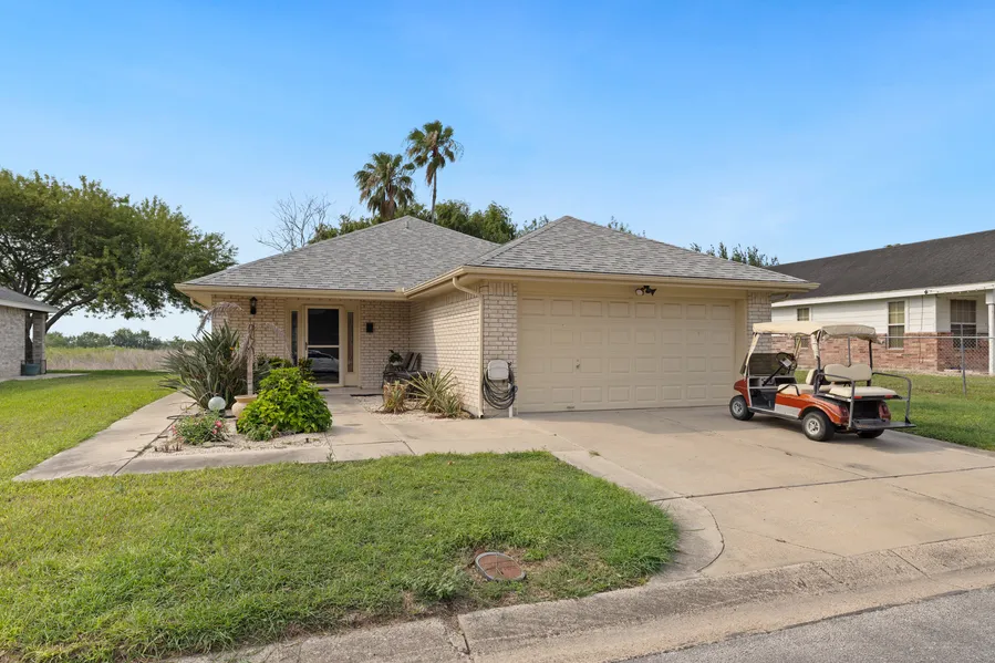 Welcome to this charming 2-bed, 2-bath + bonus room home is nestled in the gated 55+ community in Harlingen! Sitting on two lots (approx. 75.4 ft wide by 96.2 ft deep), this home offers extra yard space perfect for relaxing or gardening. The spacious living area flows seamlessly into the dining space and kitchen. The kitchen is equipped with ample cabinetry and counter space, catering to all your culinary needs. The spacious primary bedroom includes its own private bath, while two additional bedrooms are great for guests or a home office. Step outside and enjoy the Texas breeze in your generous backyard or take a short stroll to enjoy all the community amenities. Lakewood Village offers a friendly, active lifestyle with access to a sparkling pool, clubhouse, planned activities, library, pool tables, shuffleboard and a country club atmosphere—all within a beautifully maintained, HOA. New Roof as of 2016