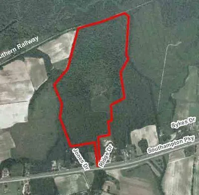 Southampton Tax Map # 67-35. It is located just east of Adams Grove. The property has 50-foot frontage on Highway 58. The property is completely wooded with 40 acres +/- of pines planted in 1992, 5 acres of pines planted in 1998 and the remainder in a natural mix of hardwoods and pines. The subject property is within 8.5 miles of Emproria and 17.5 miles of Courtland.