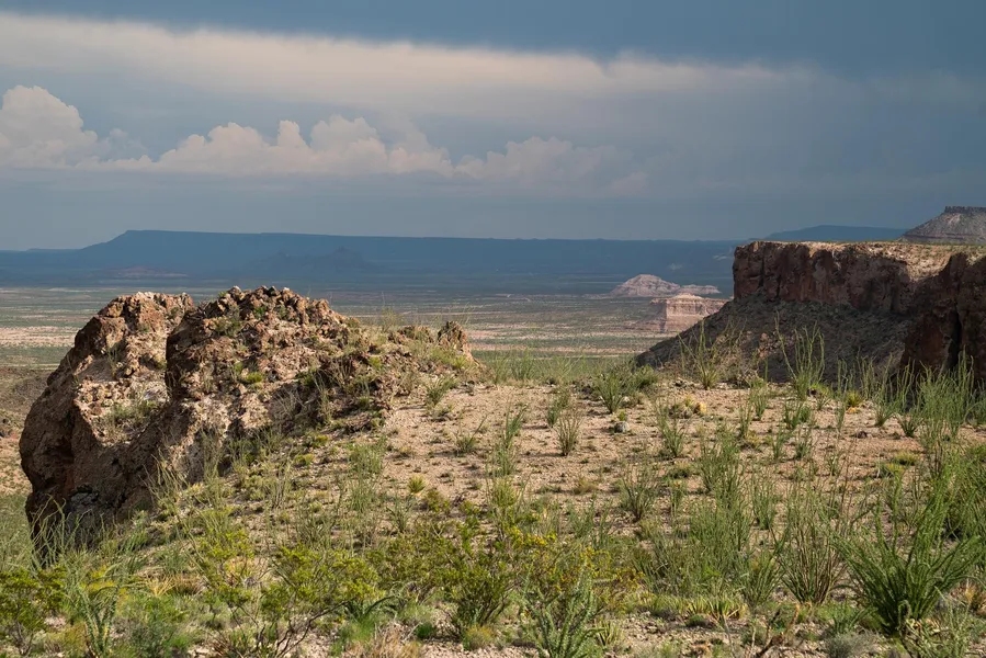 The landscape features rolling hills, mesas, canyons, grasslands, and scrublands, all set against a backdrop of rugged mountain ranges visible from nearly every point on the property. A classic example of "Cattle Country" from the Old West, Ocotillo Rim Ranch has preserved much of its historic environment and appearance. This region is part of the high Chihuahuan Desert and supports vegetation such as Spanish dagger, yucca, mesquite, creosote, catclaw, ocotillo, and cholla, interspersed with grasses like blue grama, black grama, bear grass, and sideoats grama. Canyons and creek beds support denser brush including mesquite, desert willow, Mexican walnut, soapberry, buckeye, whitebrush, hackberry, juniper, and oaks.