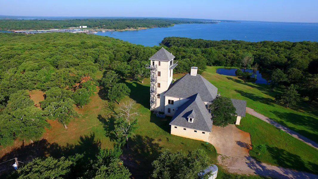 Behold XIT, the quintessential ranch overlooking Lake Texoma, exuding Cowboy Mystique at every turn!..situated on 48 developed acres of rolling terrain, including 1 stocked fishing pond and a large barn with attached apartment. XIT is an exotic home nestled in the trees, boasting a FIVE story tower with spectacular views of the lake...Passionately built and decorated with attention to every detail, the Ranch House is the Taj Mahal of Texoma,...Over 30 European doors, some with stained glass, from the 1800's have been artistically integrated into the home construction with old barn wood trim to complement the home's unique style..Elevator up to the 2nd floor housing the large master bedroom suite, game room, bunk room and guest bedroom..The tower has a private bedroom and bath on each floor and is crowned by a bar or additional bedroom on the 5th floor, with spectacular lake views ..Located on a private road and surrounded on 3 sides by USA land..your opportunity to create memories..