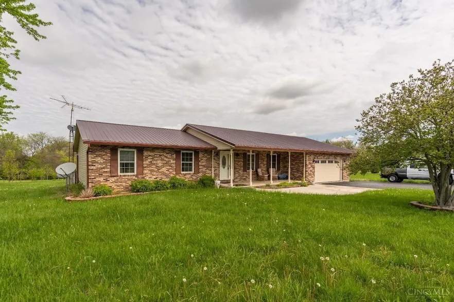 Beautifully remodeled ranch with over 1,700 sq ft and beautiful hardwood flooring, the kitchen features custom wood cabinets, a stylish backsplash, solid surface counters, and an eat-in bar. Sitting on just over 3 acres, enjoy mature fruit trees, a 20x30 outbuilding with leanto (perfect for a workshop or 2-car garage), fenced areas, and a chicken coop for your hobby farm. The large back deck is great for entertaining, plus there's a shed for tools. Brick exterior, metal roof, and wooded views offer privacy and lasting charm. Country living at its best!