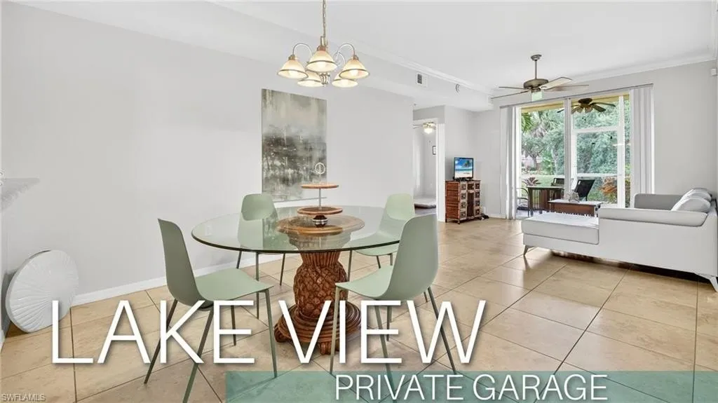 SELLER IS READY TO GO!! ROCK BOTTOM PRICED!! THIS ONE HAS IT ALL!!! GREAT PRICE, PRIVATE GARAGE, LAKE VIEW, PRIME SPOT IN THE COMMUNITY, FABULOUS AMENITIES AND SUPER HOT ESTERO LOCATION!! Features of this wonderful 2-bedroom, 2-bath condo include tile and wood floors throughout (no carpet), awesome kitchen with granite countertops, stainless steel appliances and 4-person raised breakfast bar; popular open concept floorplan, lots of natural light, super spacious Main Bedroom with 2 closets (one of them is a large walk-in closet) and ensuite bath, large guest bedroom, large guest bath, upgraded fans and fixtures throughout, crown Moulding throughout, covered and screened lanai overlooking the lake and tropical foliage, IMPACT RATED WINDOWS and much more!! This condo is set in an ideal, lower density, quiet location of the community with tons of guest parking and no buildings to the front!! Amenities include private gate, multiple swimming pools, brand-new tennis/pickleball courts, a great fitness center, movie theater, ice cream parlor, and a full-menu café with great prices open seven days a week! Located close to the area's best shopping, dining, Miromar Outlets, Gulf Coast Town Center, entertainment, bars, and just a short drive to the beach, this condo is a great value and hard to beat!! Call for your private showing today!!