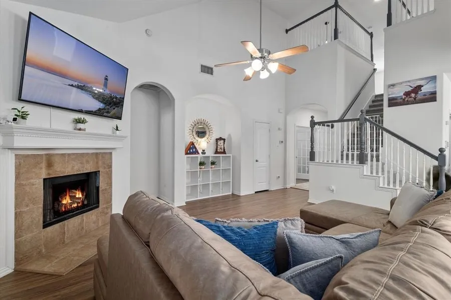 Welcome to this beautiful 1.5 story home situated in the master planned community of Providence Village. Gorgeous, easy to maintain wood-look tile floors invite you inside this 3 bedroom, 2 bath home. Once inside you'll be invited by french doors leading into a private home-office. Make your way into the open-concept entertainment space offering seamless sight-lines from the living room, kitchen and dining area. Entertain friends and family in the light filled living room highlighted by a wood-burning fireplace and wall of windows. Enjoy preparing home-cooked meals in the fully equipped kitchen featuring granite counter-tops, Frigidaire stainless steel appliances, 5-burner electric oven, modern painted cabinets, spacious island and built-in work station. Retreat to the secluded primary bedroom complete with a tranquil ensuite bath with dual sinks, large soaking tub, separate shower and walk-in closet. Two secondary bedrooms share a well-appointed full bath. The whole family will enjoy spending time upstairs in the spacious bonus room with plenty of room for a pool table or used as a media room. A wonderful heated and cooled sun room could be used as a play room or whatever your families needs require. Kids and pets will love spending time outdoors with a paved patio and storage shed.