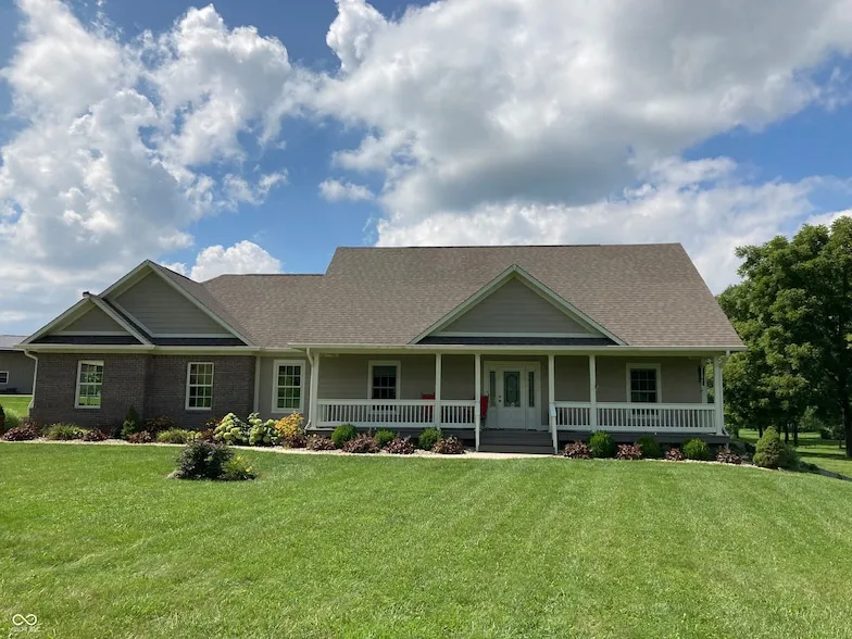 Custom-built home on 5.2 acres with mature trees from former Christmas tree farm only 20 min. from 465, 30 min.to airport, & 30 min. to Bloomington. Solar panels (18) provide excellent green energy. Beautiful 40' porch in the front &14'X12' screened-in porch off the living room at the back. Oversized 2+ car garage (721 sq. ft.) has space for a workbench & has attic access. Front entry has a coat closet. Laundry room has deep sink & cabinets above washer & dryer. Eat-in kitchen sits between dining & sitting areas & has both gas & electric hook-ups. Kit. has granite countertops, reverse osmosis water, & a large pantry. Walk-in closet off master bathroom. Two bedrooms with full bath between them are on opposite end of home. Flooring is engineered hardwood, luxury vinyl tile, & carpeting. Solid core doors are 3' for handicap accessibility. A 4' stairway leads to walk-out basement with concrete pad. Downstairs include 4th bedroom, exercise room, large great room, dining area, & full bathroom. Great storage throughout entire home. Gas fireplace hook-ups already roughed in. Brand new water heater. Electric panel accepts a generator. Large 48'X32' barn with 2-12'X12' sliding doors, concrete floor, 156 sq. ft loft area, & 8' awning facing east. An 8'X8' storage shed is by the firepit close to the zipline. The large garden area has thornless blackberries plus strawberries and asparagus. Perennials dot the landscape with color. Welcome to country living!