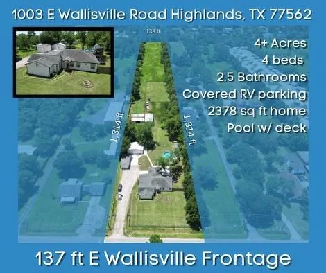 Check out this amazing Ranch Style home situated on just over 4 acres of Unrestricted Property located in the heart of Highlands, TX and just 30 minutes from Houston. The home offers immaculate upgrades and updates which include a 9ft x 4 ft Granite Island, Open concept living area, large primary with a Texas Style walk in shower complete with soaking tub. 3 other additional large bedrooms with tons of closet space. A guest 1/2 bathroom and walk in mud room. Outside you will find a covered concrete patio overlooking the back pastures, above ground pool with deck, play ground, and multiple out buildings. There is large shop perfect for RV Storage, a separate larger shop for a Man Cave or toys, a Horse Stable, and a riding arena. This land has endless possibilities and will not last long. Call your favorite Realtor today and schedule a private showing.