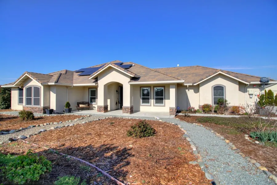 Prepare to be impressed. Sprawling single story with 4-bedrooms and separate office, 2.5 baths. A semi-custom offering a huge great room with island kitchen, plenty of work space and an abundance of storage including a pantry. Covered sitting areas out back for entertaining, a waterfall feature and a fully fenced landscaped backyard. Add in the huge drive-in shop along with additional covered parking and you've found a place that has it all. Additionally, no Mello-Roos or HOA.