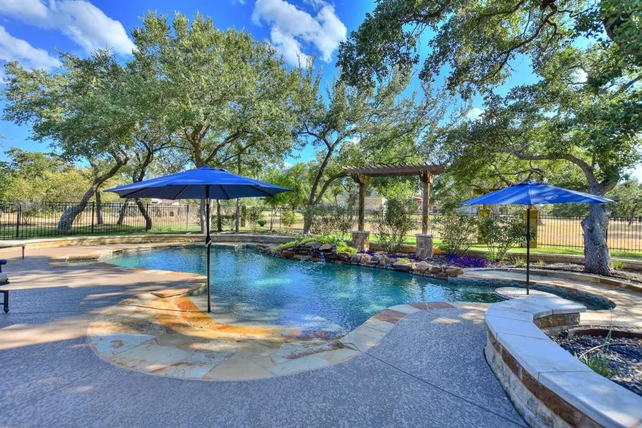 Beautiful new metal roof just installed with a 50/100 year transferable warranty! Don't miss this stunning one acre dream home in desirable Estrella. Located in a beautiful unique pocket of Georgetown with city utilities, natural gas, 1.9 tax rate, and easy access to shopping, dining, and schools. This luxury home sits among mature trees and the one acre lot provides ample space and privacy. The large iron french doors, flanked with two outdoor water fountains, welcomes you into a beautiful open plan with views of the resort like pool. The pool features a waterfall, beach area, and swim up table for eating/drinking. This meticulous home features a gourmet kitchen with Wolf range, Wolf double oven, pot filler, and a granite custom island. Off from the kitchen is a unique Italian style wine cellar, complete with built in wine refrigerator and space to sit and visit. The well designed floor plan gives every room its own bathroom and privacy. The master bathroom is designed for a serene retreat - large soaking tub, walk through shower with multiple shower heads, double vanities, and surround sound. The three car garage has epoxy flooring and built in storage space. The large one acre lot is fenced with space beyond fence for privacy or can be used as desired. This property boasts luxury features that must be seen! Call for an appointment to view.