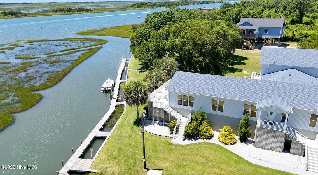 Waterfront living at its finest! With a prime location on the Intracoastal Waterway, 'Mystic Breeze' is designed for both relaxation and recreation. Offering over 3,600 square feet of living space, this home is move-in ready and perfectly suited as a full-time residence, second home, or investment property. Inside, you'll find two full living areas, each with its own kitchen, providing privacy and comfort for guests or multi-generational living. The primary suite features an en-suite bath and two walk-in closets, while the two additional bedrooms offer flexible sleeping arrangements, including a fun bunk room and a spacious guest retreat. 3 full baths finish the space. The top-floor bonus/flex space provides even more room to spread out. Easily whitewash the walls in the addition for a cool bright beach vibe. ''Mystic Breeze'' is just minutes from Swansboro, area beaches, and local sandbar style islands. A community boat ramp next door adds even more convenience. Pull up to the dock on your boat or jet skis to load up. After a day on the water, rinse off in the solar-heated outdoor shower, a thoughtful touch that enhances the coastal experience. Kayaks, fishing poles and life jackets store nicely in the enclosed space under the deck. Additional features include the 2 main oversized garages with space for a boat, jet skis and a car. The other 2 garages have ample storage for all of the vacation gear. No need to worry about carrying luggage or groceries up the stairs, a residential elevator is easily accessed from the larger garage with entry just off of the laundry room on the upper floor. A portion of the back yard is fenced so the fur babies can safely run around. Whether you're hosting guests for the weekend or enjoying a quiet coastal evening watching the boats go by from your back deck, this home offers comfort, convenience, and the best of waterfront living. Make Mystic Breeze your permanent vacation destination! Call today to schedule your private tour