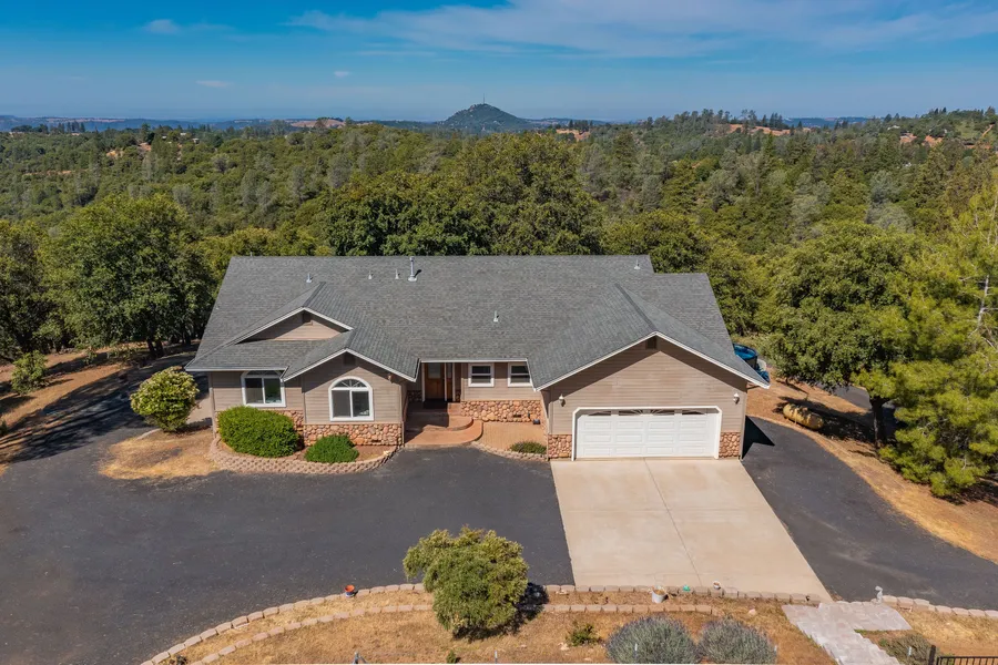 One story living, spectacular views & privacy! A gated entry leads up the hill to your move-in ready home. Vaulted wood plank ceilings & picture windows compliment the spacious living area complete with double-sided fireplace. The kitchen features granite counters & bar seating with plenty of counter space for gourmet cooking. The breakfast nook enjoys views & deck access. Step out your master to soak in the spa under the stars. The master also has a walk-in closet & en-suite bath. There are also 2 guest bedrooms, bath & indoor laundry. Downstairs offers separate living space with 4th bed, full bath, wet bar & entertainment area. A 2-car attached & 1-car detached garage offer an abundance of storage. Outdoors you'll find many areas to enjoy, an above-ground pool & decks, patios, walking trails & outdoor gym area. A highlight of this property is the fenced garden area with raised garden beds & olive trees ready for the master gardener. Harvest the olives or not--just enjoy the serenity of the orchard and watch the turkeys and bunnies come to eat the olives on Thanksgiving! Don't miss this truly special home.