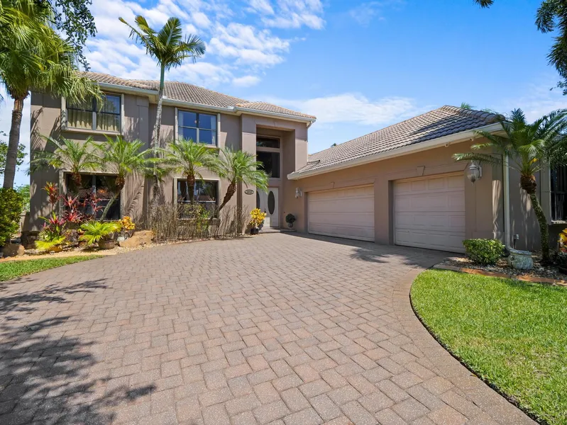 Nestled along the 15th hole of the scenic Baytree Golf Course with tranquil lake views, this stunning two-story home offers the perfect blend of elegance and functionality. Boasting 4 spacious bedrooms and 3.5 baths, including a luxurious primary suite and a guest bedroom on the main floor, the home is ideal for both family living and entertaining. A dedicated study/library features rich built-in wooden shelving, while soaring vaulted ceilings in the family room create an airy, open atmosphere. The formal living and dining rooms provide classic charm, and the expansive kitchen is a chef's dream with a large island accented by a decorative copper sink and an adjoining eat-in area. Step outside to a screened-in pool and patio, perfect for relaxing and enjoying golf course and lake views. Additional highlights include a 3-car garage, hurricane shutters, and a spacious upstairs balcony that enhances the home's appeal.