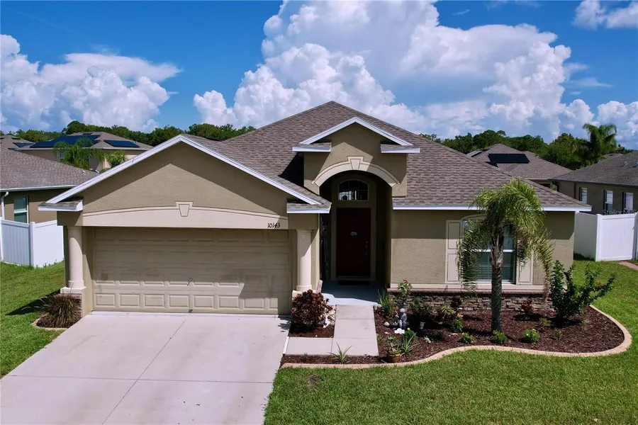 Welcome to this stunning 2017 The Normandy Model in the sought-after Briar Oaks community! This spacious 4-bedroom, 3-bath home offers a thoughtfully designed open floor plan perfect for modern living. The upgraded kitchen features beautiful 3cm Santa Cecilia dark granite countertops with a half bullnose edge, a 5-inch backsplash, stainless steel undermount double sink, and a convenient pull-out sprayer faucet. Enjoy casual meals at the large breakfast bar or host gatherings in the separate formal dining area. The expansive great room boasts soaring ceilings, making it a perfect space to relax or entertain. The primary suite offers a walk-in closet and a luxurious ensuite bath with dual sinks, a garden tub, and a separate shower. Three additional bedrooms are smartly positioned for privacy, including a front-facing 4th bedroom ideal for guests or a home office. Ideal for siblings or shared living, a Jack and Jill bathroom sits between two bedrooms, creating a smart and practical layout. Step outside to enjoy both front and rear covered lanais, perfect for year-round Florida living. Additional builder upgrades include stone veneer accents, a garage door opener, and energy-efficient features like a hybrid water heater and insulated windows. Recent updates include stylish waterproof vinyl flooring and concrete landscape curbing in the front yard. Located in a peaceful setting yet close to Tampa Bay beaches, golf courses, shopping, and dining. Briar Oaks offers fantastic community amenities including a playground, dog park, sidewalks, and street lighting—all with a low HOA fee. This home combines style, comfort, and convenience—schedule your showing today!