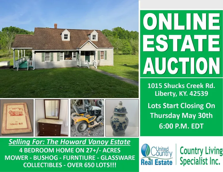 ONLINE-ONLY ESTATE AUCTION: Get registered today for our online auction for the Howard Vanoy Estate. Included in Mr. Vanoys estate is a 4 bedroom 1 bath home with basement on 27+/- acres. Approx. 14+/- acres are cleared and would make great pasture for livestock. A creek runs through the property as well providing a water source for animals and other wildlife. The home was built in the 1940s with recent remodels completed on the upstairs living areas in April of this year. The main floor contains a large living room along with a kitchen that has a stove and refrigerator that will remain with the home. Next to the kitchen is a separate dining room with the full bathroom at the back of the home. Beyond the dining room is a guest bedroom with the master bedroom being at the front of the home on the main floor. The newly remodeled upstairs contains two additional bedrooms with one having a huge walk-in closet. The home has central heating and air along with a woodstove in the basement for an additional heat source. The walk-out basement gives lots of room for storage as well. The access road to the pastures across the creek and on the hill are in need of repair since it hasn't been used for several years. Along with the home the property has two large barns with two smaller storage sheds.