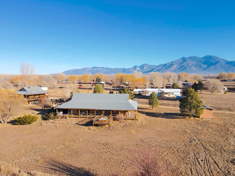 What is appealing about this property? Well, maybe we should start with the factthatthis property features three fully self-contained living spaces! The territorial style main house with a completewraparoundcovered deck with 3 bedrooms, 3 bathrooms, and 2,415 square feet of living space; an 800 square foot guest house with 1bedroom, a loft, 1bathroom, and anotherwraparoundcovered deck; and a 452 square foot studio apartment. The 2,000+ square foot wraparound covered deck off the main house is not to be understated! Wrapping around the entire home,this wide deck incorporates asunkenhot tub (with a view!) and provides multiple areas for outdoor dining, entertaining, and enjoyment. Inside, the elevated kitchen overlooks the large living room with vaulted ceilings, creating an open,yet defined,layout. A honed sandstone countertop from Loveless Stone is the highlight of the kitchen. The master bedroom, tucked at the end of the downstairs hallway, features a privateensuitebathroom thats unfinished and ready for a buyer to complete - the reason the list price is well below the mostrecentlyappraised value. The two guest bedrooms downstairs are generously sized, with one currently serving as a library/office. A full guest bathroom with a tub is also located on the main level of the home. Up a spiral staircase in the living room, youll find a large, open upstairs room with its own full bathroom; the perfect place for a game room, hobby space, or extra bedroom. The guest house and studio are integrated under one roof, distinctly separate from the main house, with the guest house occupying the entire second floor and offering great views that extend for miles in every direction. Equipped with a mini split unit, the guest house is easy to heat and cool, keeping utility bills in check. On the ground level, the studio apartment shares space with a 348 square foot workshop, perfect for storage or any hobby you may have. Adjacent to the studio, a 1 car carport allows for covered parking. Set on two lush acres in the Ranchitos valley, the setting offers privacy and a peaceful rural feel thats hard to come by for a property,that is a mere 6 minute drive from the Taos Plaza. Not to mention thewide-openviews of Taos Mountain and the Picuris Range, a rarity this close to town! Large trees dot the property and are maintained by ground water, no irrigation system needed. Flagstone patios, thoughtfully placed latilla fencing, and natural grasses surround the property. A private well provides the domestic water;natural gas connection keeps your gas bills low;high-speedinternet is provided by Taos Net. Come see where the grass grows tall, the views never disappoint, and the living or investment options are boundless!