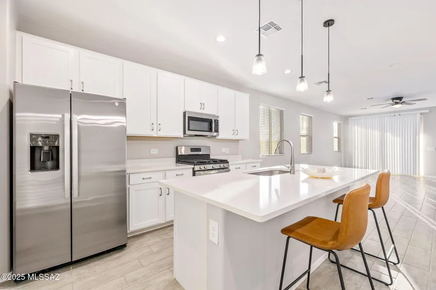 This beautiful, like-new home offers 4 bedrooms, 2 bathrooms, & a den within a spacious split-bedroom, open-concept floor plan. Elegant wood-look tile flooring flows throughout the main living areas, creating a modern & inviting atmosphere. At the heart of the home, the gourmet kitchen shines w/ sleek quartz countertops, large center island, & SS appliances. The primary suite offers a peaceful retreat, while the additional bedrooms & den provide flexible spaces for a home office, guests, or hobbies. Step outside to a large backyard with low-maintenance gravel landscaping & peekaboo Catalina Mountain views, offering a blank canvas to design your dream outdoor space. Located within the highly acclaimed Vail School District, this home combines contemporary design w/ an exceptional location.