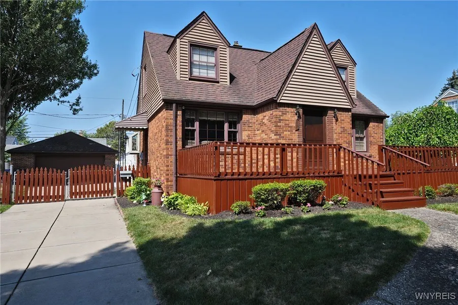 Classic Brick Colonial Cape on fenced double lot w/ 2.5 car garage on lovely neighborhood street. Perfection and quality finishes from the front porch to the rear patio. The home offers the ability to enjoy both formal and casual living. The front entry foyer opens to the formal living rm and dining rm with hardwood floors and natural woodwork while the extra large family rm/dinette combo w/ gas fireplace and solid wood paneled walls offers a relaxing space and steps to the covered patio and yard. The kitchen centers the home with wood cabinets, garden window and all appliances. Choose your primary bedroom on the 1st floor or the equally large bdrm upstairs with great office/den space and 3rd bdrm. Fully remodeled modern, tiled bath w/ whirlpool tub. More living space in the finished, divided basement. Rec Room with bar, ( Bar stools and small refrigerator included), separate workout room, den, storage, laundry room. Affordable city taxes on border of West Seneca. See attachment with updates. Opportunity to own a move-in ready home.
