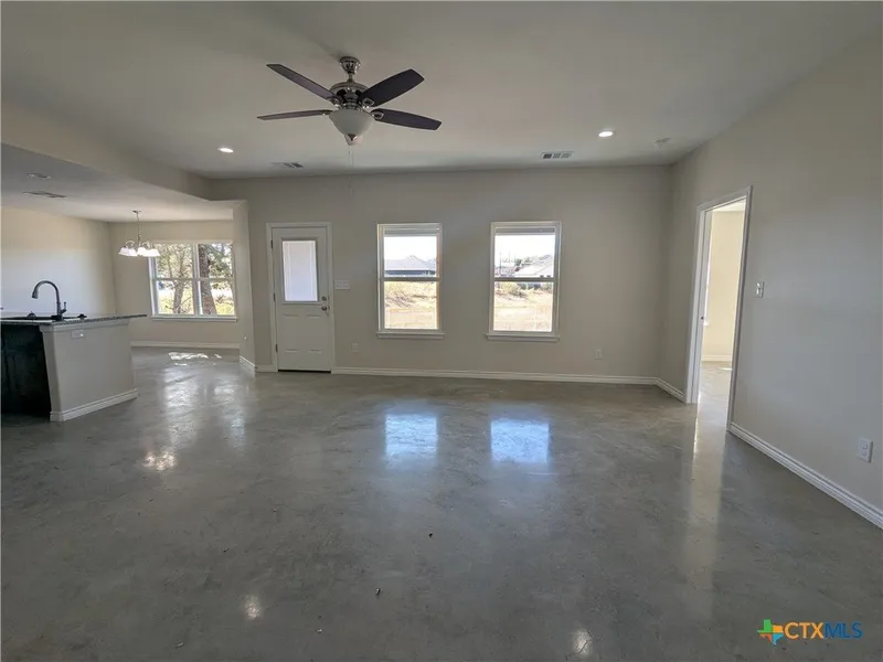 Welcome to your dream home in Lampasas's sought-after Stone Valley subdivision! This exquisite new construction features stained concrete floors, a luxurious primary suite with a tiled shower and walk-in closet, and a secondary bathroom with a fiberglass tub and stylish tile surround. The kitchen is a chef's delight with granite countertops, tile backsplashes, stainless steel appliances, and convenient washer and dryer hookups. The exterior combines timeless brick and wood siding with a durable composition roof and an oversized garage. Outside, enjoy a fully sodded yard with a sprinkler system and a wood privacy fence, perfectly blending beauty and practicality.