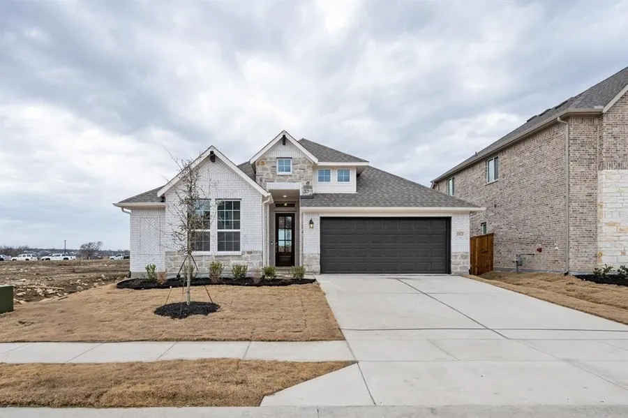 MLS# 21058723 - Built by Pacesetter Homes - Ready Now! ~ This 3-bedroom, 2-bath single-story home offers a smart layout with stylish finishes throughout. The white brick and stone exterior gives it great curb appeal, and inside, you'll find a private study and an open-concept living space that's perfect for both relaxing and entertaining. The family room features a 42 linear fireplace with a tile surround and box beam mantel, and flows easily into the kitchen, which includes white cabinetry, Bella Blanco quartz countertops, a glossy herringbone tile backsplash, and GE stainless steel appliances with a gas cooktop and built-in oven. Engineered hardwood flooring runs through the main living areas and study for a clean, polished look. The primary suite is tucked away at the back of the home and includes dual vanities and a large glass-enclosed tile shower. A covered patio with a gas drop is ready for your future BBQ grill, and the 3-car tandem garage offers extra storage or parking space. Your Pacesetter Home comes equipped with a suite of smart features designed to enhance everyday living.-Ring Video Doorbell-Brilliant Smart Home System to control lighting and music-Honeywell Smart T6 Thermostat for energy savings-WiFi-enabled Garage Door-Rainbird Wifi-capable Sprinkler System Plus, enjoy added support with White Glove Service - a personalized, post-closing appointment to get all your smart home features connected and ready to use.