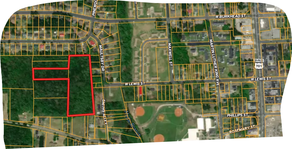 Research Parcel InformationFrom Whiteville, head south on NC-910 S (Maultsby Drive). Continue past W Burkhead Street; the property lies at the intersection of Maultsby Drive and Pinewood Drive. Look for the wooded acreage on the south side of Pinewood Drive.