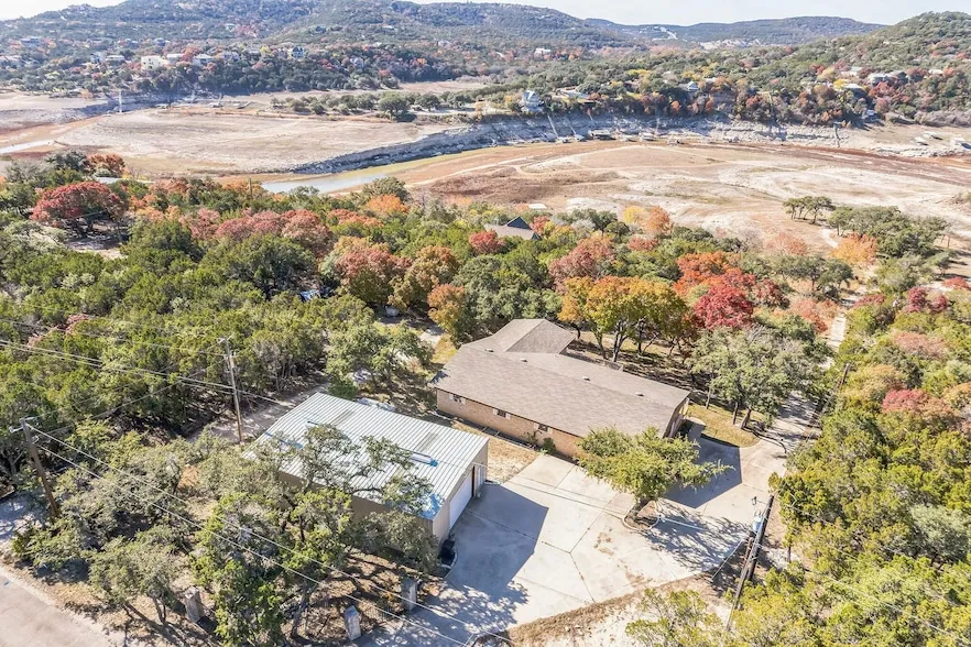 Rare opportunity to have lake living in Trails End on the shores of Lake Travis! As you enter the property, a large (1500 sf) highly functional powered workshop with two entry points and an extra slab is on the left. The 1 story, 4 bedroom house (2406 sf) is situated in the hills with grand views of the treed property down towards the lake. The house is all brick and has a grand deck on the lake side. Endless possibilities with this: build your dream home, put your own twist and touches on fixing up the existing house, possible short-term rental (STR), AirBNB, etc. Located around 30 miles of downtown Austin, you get access to major roadways, great schools, shopping, major employers, etc. We welcome you to come take a tour! Virtually Staged: Digital furnishings shown to suggest space use. All information provided is deemed reliable but is not guaranteed and should be independently verified.