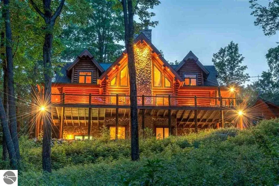 Surround yourself with nature in this grand Northern Michigan log home nestled in the woods near the historic village of Alden. Situated in a gated community of executive homes all on spacious lots with ample privacy, you will enjoy 380' of private frontage on Green Lake for fishing, paddling, and endless opportunities for wildlife viewing. Newly updated and fully outfitted with modern amenities and high-end finishes, this 4000 sq/ft, 2-story home is your refuge from the hustle and bustle of the world. Unwind in the spacious open-concept living area with cathedral ceilings, large windows, and refinished hardwood floors. Entertain in a kitchen equipped with Cambria countertops, stainless steel Wolf, & Samsung appliances, and a bar seating area. The main floor primary bedroom opens onto the expansive water facing deck perfect for morning coffee or evening cocktails. Visiting friends and family can feel right at home in the beautifully finished one bed, one bath guest quarters above the detached 3-car garage. Stroll along the inlaid stone pathways and take in the magnificent landscape throughout the property, wandering down to the lake's edge to relax on the waterside patio. The frontage features a soft, sandy floor with a gradual slope & private dock with a newly constructed cedar shed to store all your water toys. The home is heated/cooled with a closed-loop geothermal system and in-floor radiant heat to keep your feet warm throughout the cold Michigan winters. Walk-out lower level has custom fireplace, sauna, large family room and plenty of storage area. Click on virtual tour link for an incredibly realistic view of the interior!