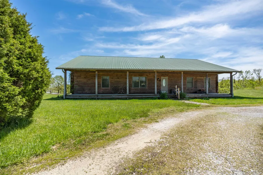 Situated on a beautiful 2.88+/- acre lake lot in Elberfeld, this log cabin home with covered front and back porches has great curb appeal. This immaculate home offers 3 bedrooms, 2 baths and an open floor plan. Upon entry, you're greeted with soaring ceilings and oak floors. This cabin offers a large dining area and living room with wood burning fireplace. The living room also features access to the covered back porch with gorgeous views of the lake. The large kitchen with island offers an abundance of hickory cabinetry, appliances included, and pantry. The spacious owner's suite has an ensuite bath with walk-in shower as well as another wood burning fireplace and access to the back porch. The laundry is conveniently located off of the primary bath. There are two additional bedrooms with access to the full hall bath with tub/shower combo. The home also includes a 25x10 shed for additional storage. This wonderful home in a private setting offers a stocked lake for fishing and is just minutes from I-69 and convenient to major employers, shopping, and dining in both Vanderburgh and Warrick counties.