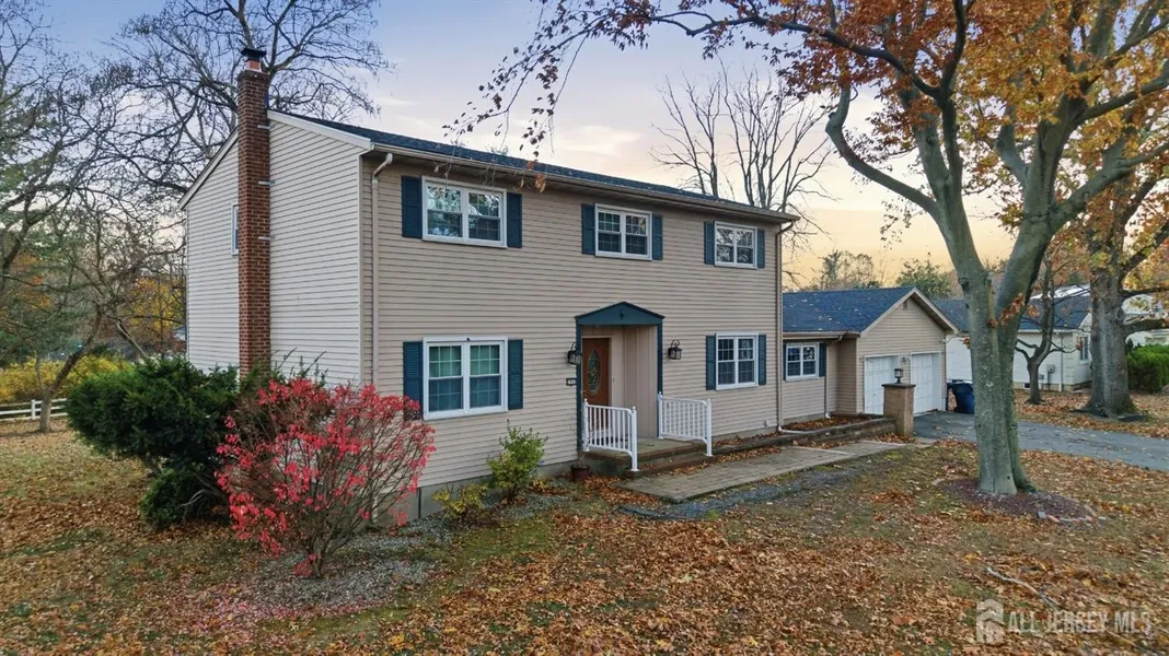 Elegant 4BR/2.5BA center-hall Colonial blending space, function, and style in a sought-after neighborhood. A covered front porch and paver walkway with stone garden walls lead to a welcoming open foyer with twin coat closets. The classic center hall reveals a large formal living room and a formal dining room, both with hardwood floors and decorative molding. The bright, well-appointed kitchen features cherry cabinetry, Corian countertops, stainless steel appliances including a French-door refrigerator, a vented range hood & pantry closet. Sliding doors open to a porch that steps down to a large concrete patio and an expansive, rectangular backyard with a storage shed ideal for play, pets, and entertaining. Off the kitchen, a sunken family room offers laminate flooring, overhead lighting, and a charming wood-burning fireplace set against a brick accent wall with mantle and hearth, plus direct access to the oversized two-car garage with a rear service door to the yard. Upstairs, all four bedrooms feature hardwood floors and overhead lighting. The updated hall bath presents a cherry vanity with granite top, tile flooring, half-height wall tile, a tiled tub/shower, linen closet, vanity lighting, and a vent fan. The spacious primary bedroom includes a WIC and a private full bath with cherry vanity and granite countertop, medicine cabinet, vent fan, tile floors and walls, and a step-in shower with clear glass doors. The full finished basement expands the living space with laminate floors, a large recreation area, two flexible bonus rooms (one with a closet), a utility room with shelving/cabinets and a utility sink, and generous storage including an under-stairs closet. Additional highlights include large driveway with off-street parking for four, and easy indoor-outdoor flow from kitchen to porch, patio, and yard perfect for everyday living and memorable gatherings. Close to NYC Bus/train, shopping & all major roadways. A great opportunity to own a well-maintained home with plenty of space and thoughtful updates in a desirable location.