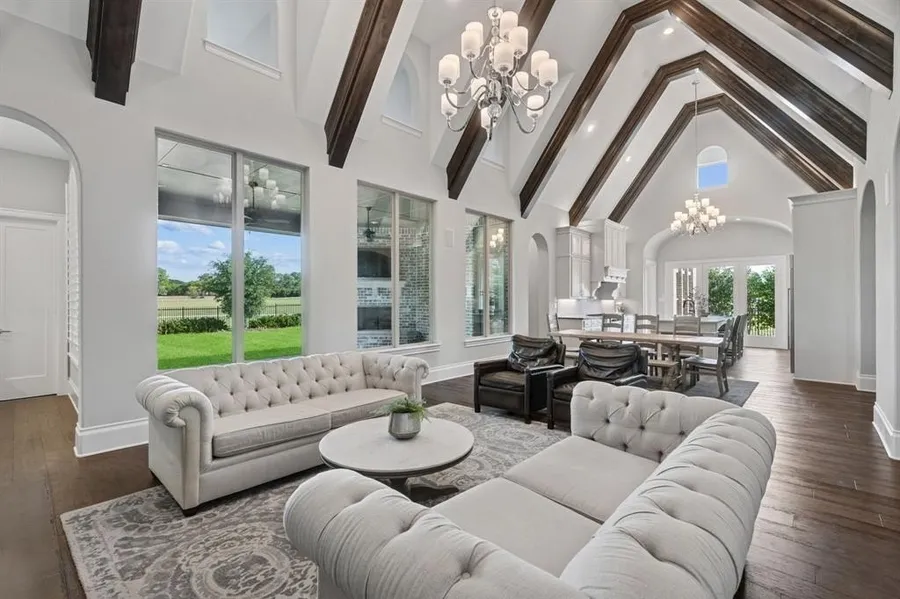 Welcome to this Huntington Home in highly sought-after Whitley Place in Prosper ISD, offering over 5,000 square feet of refined living space and exceptional design. Nestled next to a park and just a short walk to the POOL & elementary school, this home backs to a greenbelt walking trail, providing a peaceful & private setting. The stone & rock exterior sets the tone for luxury living, with a double door entry that opens to stunning interiors featuring arched doorways, bullnose corners & plantation shutters. Gorgeous hardwood floors flow through the main living areas downstairs, including the elegant formal dining room with built-in cabinetry & a beautiful chandelier. The master suite is located on the main level and includes a sitting area, separate vanities, a makeup vanity, & serene views of the manicured backyard. A separate mother-in-law suite downstairs provides ultimate privacy and comfort with its own ensuite and walk-in closet. The chef's kitchen offers a massive sub-zero, wolf appliances make this a culinary dream, boasting quartz countertops, a large island, pot filler, double ovens, farm sink, and a butler’s pantry—perfect for entertaining. The family room features a vaulted beamed ceiling, cozy stone fireplace with gas logs. Upstairs, you'll find a spacious loft area complete with a wet bar, built-in cabinetry, microwave, refrigerator, and a convenient half bath, ideal for entertaining or casual relaxation. Three additional upstairs bedrooms each include their own ensuite bath, walk-in closet, and ceiling fan, ensuring comfort and privacy for everyone. Enjoy outdoor living year-round with this HUGE backyard featuring a covered patio with two ceiling fans, a fireplace, plus a secondary open patio with another fireplace and ceiling fan. The wrought iron fencing adds elegance while maintaining views of the greenbelt. The oversized yard easily accommodates a future pool. Don't miss this rare opportunity to own in one of Prosper’s most prestigious communities.