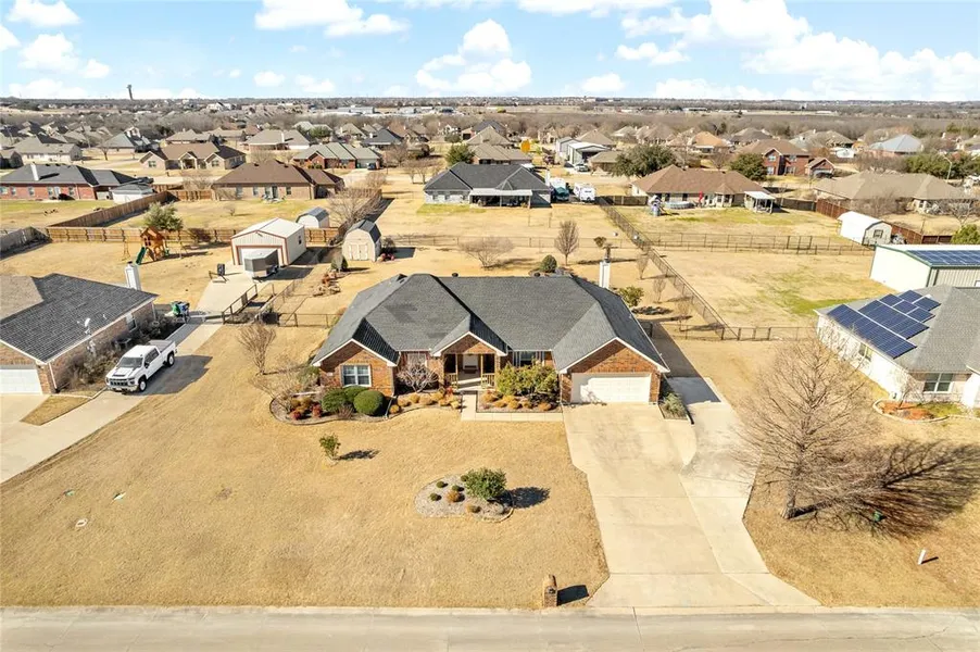 Stunning ranch-style home on a .5-acre lot. Enjoy your morning coffee or hosting summer barbecues on tbe 12 x 15 covered flagstone patio overlooking the manicured & fenced backyard with a large storage building. Once inside you'll love the extensive wood flooring and open concept layout. The heart of the home is the updated eat-in kitchen featuring granite countertops with a farm sink, center island, custom white shaker cabinetry with plenty of drawers and storage options, updated appliances, and a breakfast bar opening to the family room which offers a wood burning fireplace and double French doors opening to the patio. The versatile layout accommodates a home office, two large living areas, two spacious dining areas and a Texas-sized laundry room. Updates: Roof-2017, windows-2018, HVAC-2016, water heater-2019 plus there's an RV pad with hookups. With a home like this, you can move right in & start making memories. Don't miss this rare opportunity to own a piece of Texas paradise.