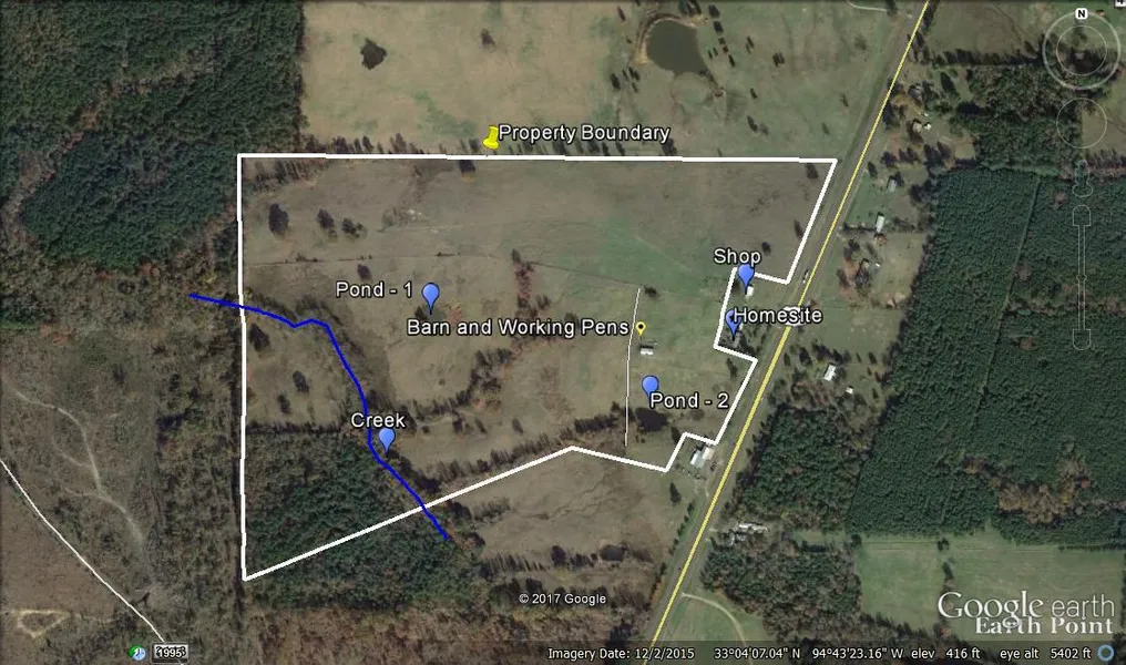 One hundred and five acres ranch. Beautiful rolling East Texas ranch with ponds, barn, working pens and cross fenced. House and shop can be bought for additional amount.