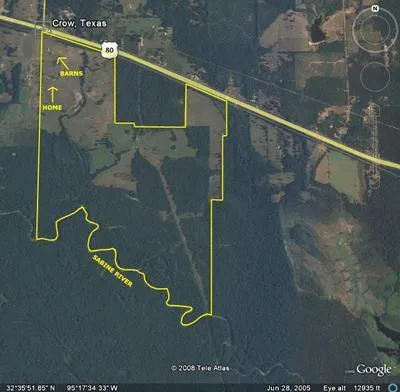FABULOUS RECREATIONAL RANCH - 1051 acres on the Sabine River in Wood County (between Mineola & Hawkins) with 2.85 miles of river frontage. Beautiful bottomland hardwood forest with all kinds of wildlife. Located near Mineola, upper portion consists of beautiful grass pastures among scattered trees and rolling terrain. A spring-fed creek bisects the property. Improvements include a 3/2 home with hilltop view, bunkhouse, 7-stall barn, storage and workshop barns. Excellent deer, wild hog and duck hunting. Monster catfish in the river. Adjacent to Little Sandy Hunting and Fishing Club.