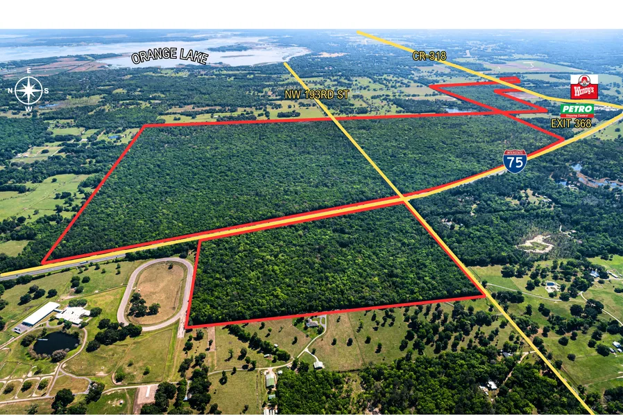The subject property is situated along Highway 318 and I-75 in Reddick in northern Marion County. It's just over 0.5 miles east of I-75 (Exit 368) and 1.25 miles west of US Highway 441. It is adjacent to the Petro Travel Center, which includes a Wendy's. The access to major thoroughfares allows for easy trips to Ocala (25 minutes), Gainesville (25 minutes), Jacksonville (1hr 30 minutes), Tampa (1hr 30 minutes), and Orlando (1hr 30 minutes). In addition, it's in close proximity to WEC Ocala Jockey Club (3 minutes), Orange Lake (5 minutes), the World Equestrian Center (25 minutes), and the Ocala National Forest (45 minutes).