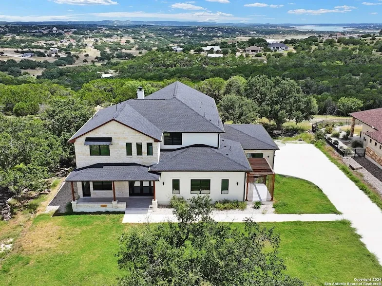 **Exquisite Hilltop Retreat with Unrivaled Canyon Lake Views** Discover the pinnacle of luxury living with this magnificent new construction, nestled atop a serene hill in the prestigious Mystic Shores community. This opulent residence, spanning an expansive 4,691 square feet across two meticulously designed levels, offers a rare opportunity to experience unparalleled Hill Country elegance and breathtaking Canyon Lake vistas. Set on over 2 acres of prime real estate, this home is a testament to refined living. The first floor is a haven of sophistication, featuring a lavish master suite, a private guest suite with an exclusive patio, and a dedicated office space for ultimate productivity. The elegant dining room and inviting breakfast area are accompanied by a sprawling back patio, designed for both relaxation and sophisticated entertaining. Ascend to the second floor to find three generously sized bedrooms, each adorned with walk-in closets, alongside a grand game room that opens to a vast balcony, offering sweeping views of Canyon Lake-a perfect backdrop for both quiet reflection and lively gatherings. With a total of 4 full bathrooms and 2 half bathrooms, this home ensures that every need is met with grace and style. The residence also includes a pristine 3-car garage with epoxy flooring, providing both functionality and flair. This extraordinary home is more than just a property; it is a lifestyle. Embrace the luxury of Hill Country living and make this breathtaking retreat your own. Schedule a private showing today and step into the unparalleled elegance and tranquility that awaits you.