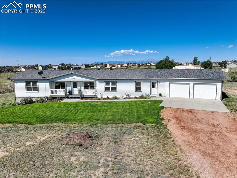 Dreaming of better than new main level ranch style living in the country yet close to the city, spread out & enjoy these amazing Pikes Peak mountain views from this liveable "Home on the Prairie" with room to add a barn on this lush property zoned for horses & plenty of room to add the chickens too! This little charming home is in incredible condition & ready to move in & simply awaiting the addition of the many out buildings you're sure to long for! Anchored by a porch in the front & an oversized covered concrete patio in the back, cooled gently in the hot summers with central air conditioning & warmed throughout in the winter with a natural gas furnace; an indoor & outdoor casual lifestyle prevails with a home town neighborly feel! As you walk in an open floor plan awaits centered around a huge country kitchen with an enchanting island & a large sink window showcasing panoramic mountain views. With a separate living & dining space up front & a comfortably sized family room which conveniently walks out the rear slider to an entertaining covered patio, there's plenty of great living space in this home. The generous private master bedroom is on a separate wing from the additional 2 bedrooms & adjoins a bath featuring a dual vanity, free standing shower & a large walk in closet. Two additional bedrooms grace the other wing, one without a closet & therefore very usable as an office & the other a really good size bedroom. A full bathroom with a tub is easily accessible to these bedrooms & the living space. A very large laundry room makes wash day a breeze & sits next to a large enclosed breezeway between the huge oversized garage & house providing a separate access door in the event you're working outside & don't want to bring the dirty duds through the tidy main house. Enjoy all nature has to offer today; with easy access to shopping, recreation, restaurants, military installations, medical facilities & more, an authentic beauty full of heart!