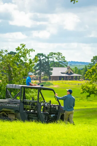 Double O Ranch, situated in eastern Bastrop County, offers a scenic property with rolling hills dotted with oaks and pines, along with some of the best-maintained pastures featuring lush coastal bermuda. Just 24 minutes from the vibrant town of Bastrop, it combines a luxurious city lifestyle with a genuine country ambiance. Located down a peaceful county road, it is quiet and ensures privacy. As you enter the property, youre welcomed by neatly maintained rolling fields with views of the home, nestled behind a stand of pine trees atop a high hill overlooking the lake and most of the ranch. The layout is thoughtfully designed, and the structures are built with elegant materials and finishes.