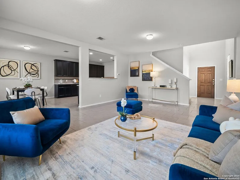 Step into stylish comfort in this thoughtfully designed Silver Canyon home, where modern finishes and a spacious layout make everyday living feel effortless. This two-story residence features 3 bedrooms, 2.5 bathrooms, and an upstairs game room perfect for entertaining or relaxing. The grand entryway with soaring ceilings welcomes you into a bright, open-concept living area that flows seamlessly into the kitchen and dining space. The kitchen offers granite countertops, a decorative tile backsplash, recessed lighting, and plenty of cabinetry-ideal for cooking and hosting. Upstairs, the private primary suite boasts a tray ceiling, dual vanities, a soaking tub, separate shower, and a large walk-in closet. Two additional bedrooms and a versatile game room complete the second floor, providing flexible space for family, guests, or a home office. Outside, enjoy a covered patio and spacious backyard with privacy fencing-perfect for outdoor gatherings. Conveniently located near shopping, dining, top-rated schools, and Government Canyon State Natural Area, this home offers the perfect blend of comfort, function, and location.