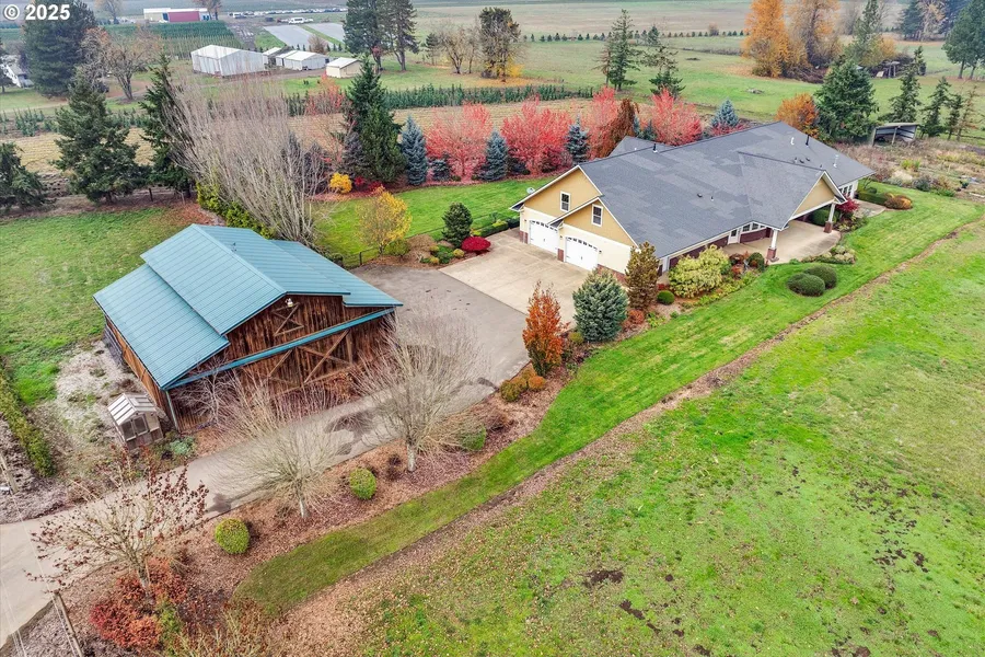 Welcome to this stunning single-level custom home perfectly situated on 5.5 acres, offering the ideal blend of luxury, comfort and country charm. Thoughtfully designed with accessibility in mind, this home provides true single-level living with wide hallways, open spaces, and wheelchair-friendly features throughout-creating a warm, welcoming environment for all. The 3-bedroom plus office, 2.5-bath floor plan showcases high ceilings, engineered hardwood floors, and an open concept that makes everyday living both beautiful and functional. The gourmet kitchen is a chef's dream, featuring slab granite counters, a gas Wolf range, double ovens, stainless steel appliances, a pot filler, and an oversized pantry. The spacious living room offers custom built-ins and a cozy gas fireplace-perfect for entertaining or quiet evenings at home. The primary suite is a private retreat with crown molding, a luxurious bath boasting granite counters, dual sinks, custom cabinetry, a large tiled shower with easy access, a soaking tub, and a generous walk-in closet. Additional highlights include an unfinished bonus area above the oversized two-car garage-ideal for a future guest suite, studio, or home gym. Outdoor living is equally inviting with expansive patios, gas BBQ hookup, and a front sitting area overlooking the property. Practical upgrades include a Generac generator, dual HVAC systems, full landscaping with sprinklers, and a 48x48 barn with four stalls, water hookups, and a loafing shed-ready for horses or hobbies. This exceptional property offers the rare combination of accessibility, craftsmanship, and acreage-all just minutes from town.