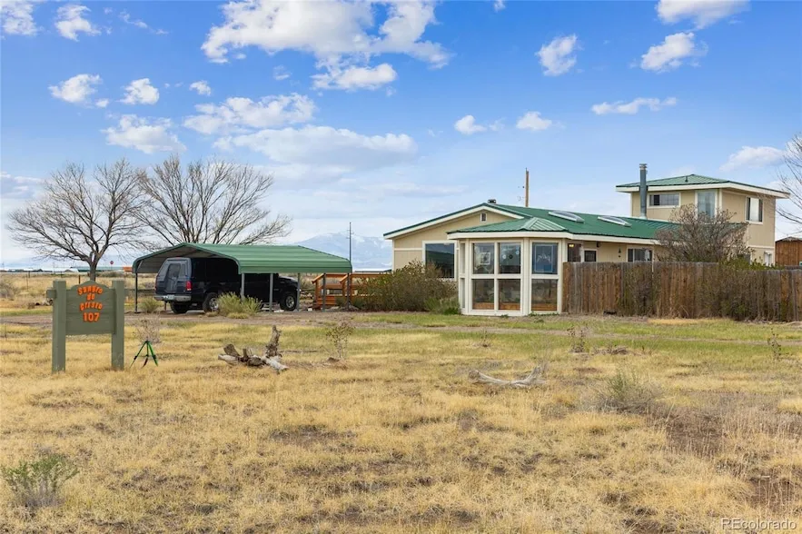 Amazing opportunity to own this unique, energy efficient home on 1.45 acres in the Town of Moffat, Colorado. Rebuilt from the ground up in 2015, and positioned perfectly to welcome in the expansive Sangre De Cristo mountain views and the abundant sunlight, this spacious home features 3 bedrooms, an office and two full baths. Approach the front of the house through a wheelchair accessible ramp onto large front deck, and then into the sizable mud room/foyer of the family room. Two large multi function rooms separated by two steps, with huge windows on the South, East and West of the home keep the living space beautifully lit all day. To the South in the sun room, floor to ceiling windows welcome the sunlight (and are a great space for plant lovers) and provide ample passive solar gain. The spacious kitchen features a central island with bar stool height counters for a great eat-in option. A unique circular fireplace that creates a stunning ambiance separates the kitchen from the dining room, which overlooks the huge back yard. Outside, a large concrete serpentine patio provides perfect spots for outdoor dining and grilling, with a fountain positioned in the middle to create a sense of tranquility. Established Chinese Elm trees and lilac bushes provide shade in the grassy yard, and the mountains in the background are framed by the wooden perimeter fence. Water flows year round from the artesian well, which fills a cistern near the well house. The lot is large enough that the owner currently hosts campers onto the East of the property, which has an RV pad and its own driveway. Across from this is a fully fenced pasture, where goats have been kept in the past. Additionally, The largest downstairs bedroom, with its own exterior entrance, could easily be converted into an efficiency apartment for additional income. Check out the Virtual tour for a complete picture of this beautiful, energy efficient home!