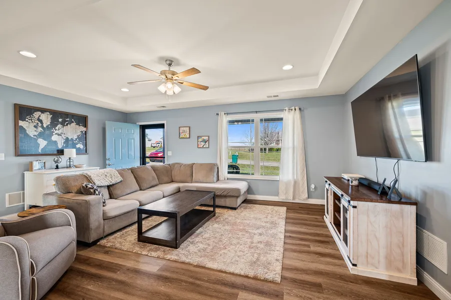 This brick ranch features 3 bedrooms, 2 bathrooms, and an open floor plan. Built just 4 years ago, this home is situated in a quiet, family-friendly neighborhood directly across from the elementary and middle schools offering both comfort and convenience. Upon entering, you are welcomed by a spacious living area with laminate flooring that seamlessly transitions into the kitchen with beautiful granite countertops. Located to the right, the master suite offers a cozy retreat with plush carpeting and an en-suite bathroom. To the left of the living area, you'll find two additional bedrooms, both carpeted for comfort, and the second full bathroom in the hallway. The kitchen leads to a back door opening onto a porch, perfect for relaxing or entertaining, with views of the backyard and surrounding greenery.