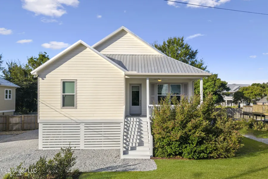 Enjoy coastal living just steps from the beach in this charming cul-de-sac community. This beautifully designed, raised one-story home offers both relaxation and convenience with its proximity to the beach, Coleman Ave, Hwy 90, and the vibrant shops and restaurants of Old Town Bay St. Louis. There is ample storage beneath the home. Unwind on two inviting porches: one at the front to catch the breeze, and another at the back with serene views of a mature magnolia tree. Step inside to be greeted by soaring ceilings with wide crown molding and an open floor plan perfect for both everyday living and entertaining. The kitchen features a large quartz peninsula, bookend shelving with an upper glass display cabinet, a five-burner gas stove, a pantry, and extensive cabinetry for all your storage needs. Adjacent to the kitchen, a well-equipped laundry/mudroom includes an extra sink, abundant shelving, and cabinets topped with a quartz counter, offering both practicality and style. The spacious primary suite boasts a walk-in closet, double vanity with quartz countertops, and a custom-tiled shower with multiple shower heads. A second bedroom, connected by a pocket door, can serve as an office or guest space with its built-in shelving and large closet. A third bedroom offers ample natural light and more ceiling-height closet storage. A second bathroom features matching quartz countertops, wide tile flooring, and a tiled shower/bathtub combo. Additional features in the home include a large, floored attic with spray-foam insulation, sound-insulated bedroom walls, and a washer and dryer, which remain with the home. The home also features a tankless gas hot water heater. The moveable fireplace and furnishings are also negotiable with acceptable offer. Furniture list provided. This coastal gem is ready to welcome you home. Schedule a showing today!