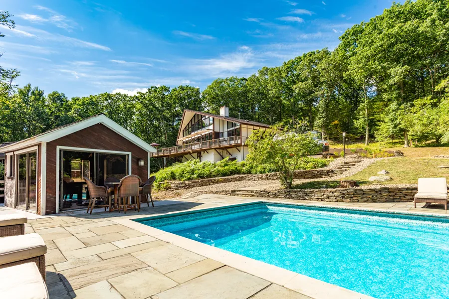 The warmth of the natural light invites you sit on the expansive deck and feel the gentle breezes with a wonderful view of your own private oasis. This architecturally designed Contemporary set on over 7 acres has been beautifully and thoughtfully updated-bright and airy with expansive windows and wrap around deck. The river rock and slate walkways add a Zen like quality with the crisp stonewalls and landscaping. The present owner has done an extensive renovation with the finest materials, yet keeping the unique Chalet feeling of this home. The kitchen has a wall of windows, granite counters, Wolf range, Subzero, fireplace and door to the deck for outdoor grilling. The living room with high ceilings has built-in book case, a fireplace and access to the deck. The dining room has two story windows and pocket doors to the kitchen. Off the kitchen is the den - a great spot to relax after dinner. Completing the 1st floor are 2 bedrooms, 1 full and 1 half bathroom. The Primary suite is on the 2nd level with a fireplace and large walk in closet, and beautiful custom bathroom. There are 2 more bedrooms and a full bath. The lower level has a bedroom, kitchen, family room, and a fireplace with a door to the outside. Take a short walk through the winding river stone and slate path to arrive at the heated in ground pool and cabana. Just minutes from the Litchfield Green, and great area restaurants, walking trails, wineries, fishing, nearby golf and more! 2.67 acres are in conservation.