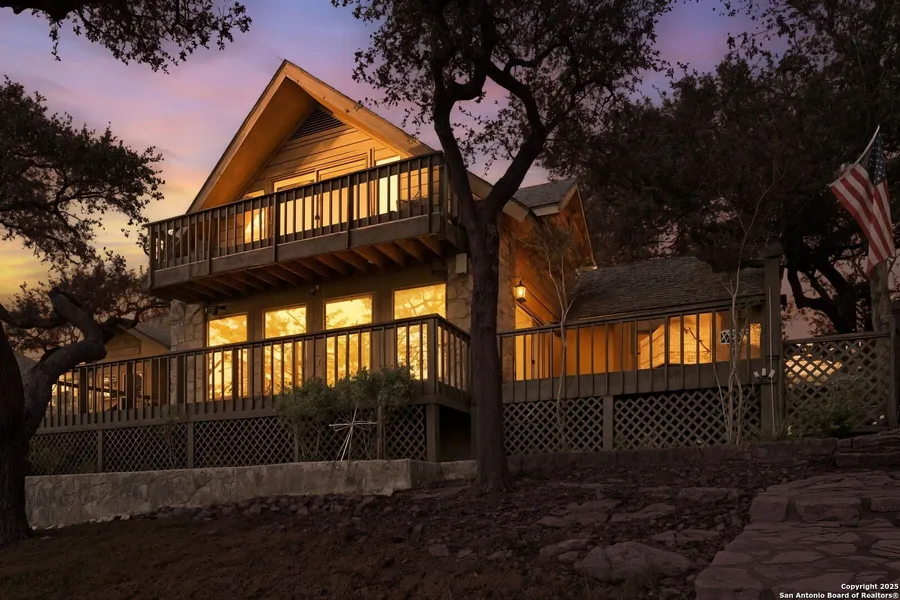 Experience stunning lake views and Hill Country serenity in this charming "Treehouse" retreat, nestled among beautiful mature trees on an oversized lot. Thoughtfully updated throughout, the home offers a remodelled kitchen, refreshed primary bath, and recently installed windows that frame the natural surroundings. A spacious 24x32 detached shop/garage with A/C provides the perfect space for projects, storage, a game room, or lake-day prep. The wraparound porch captures panoramic lake views - ideal for morning coffee, evening sunsets, and unforgettable gatherings. Additional peace of mind comes with a septic system replaced approx. 4 years ago. Located minutes from the marina, boat rentals, swimming access, local restaurants, live music, wineries, and Hill Country destinations like the Guadalupe River, Wimberley & Fredericksburg. RV/boat parking allowed in the community - a rare perk. A beautifully updated view home that truly lives up to its name - the Treehouse - and one you won't want to miss.