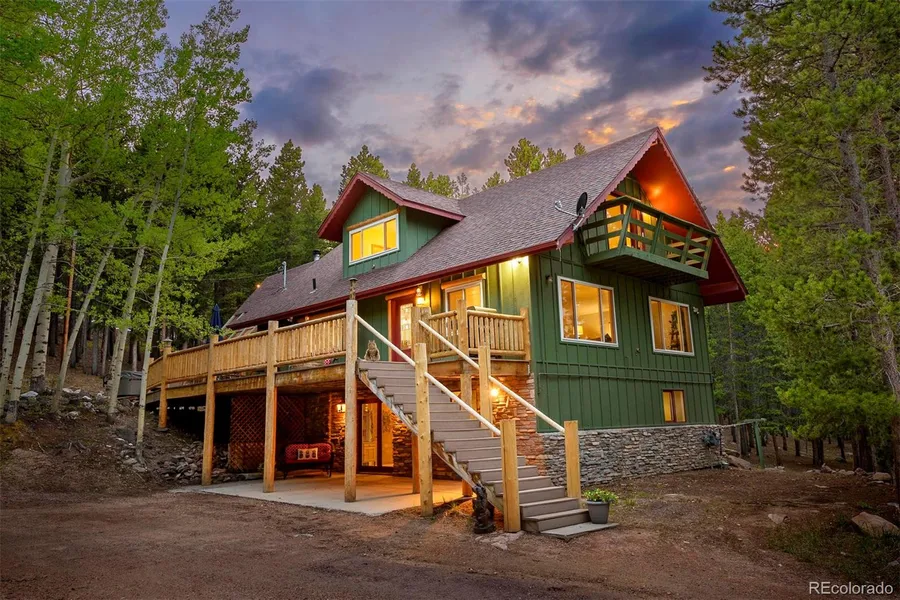 Welcome to this masterfully updated home situated on a serene quiet wooded 2-acres that is only minutes from Hwy 285 and Conifer's amenities. As you enter the home from the large deck, you will be greeted by beautiful designer touches in the open concept main floor. Canadian Ash hardwood floors, Dolomite Marble counters, reclaimed wood accents, kitchen island and peninsula, gas stovetop, tongue and groove ceilings and, an abundance of cabinetry. The Sunroom with brick floors, just off the kitchen, is the perfect place to take in the trees while a wood-burning stove keeps you warm on cool nights. The main floor also boasts a large bedroom, updated full bath, and access to the cellar from the sunroom, which is the perfect temperature for your own wine and beer storage. Upstairs you will find 2 bedrooms, loft, deck and, a beautifully updated bathroom with soaking tub, which all currently serve as an elegant master suite. In the walk-out basement are two additional bedrooms, an updated full bath, a family room with a built-in entertainment center, and laundry. Outdoors, entertain on the composite deck with log railings or on the covered patio. A pass-through driveway makes toy and RV storage a breeze. An oversized 3-bay 36'W x 30'L garage, with 8' garage doors, is large enough for workbenches, vehicles and, camper. The unfinished bonus space above the garage is ready to be finished into a game room, guest quarters, office, etc.