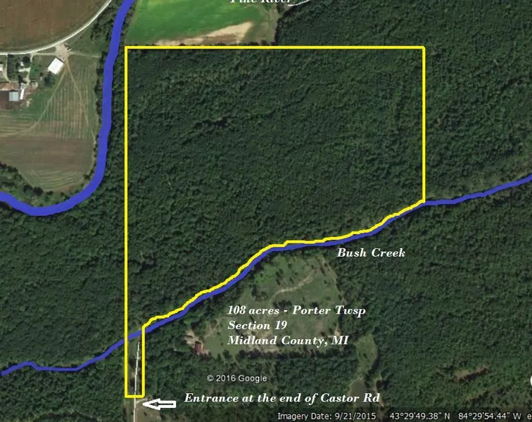Completely wooded and located at the end of a dead end road, Castor Rd. A trail leads you across the creek at the entrance of this property, and then up and down the hills until you come to the beautiful Pine River that lies just north of the property.