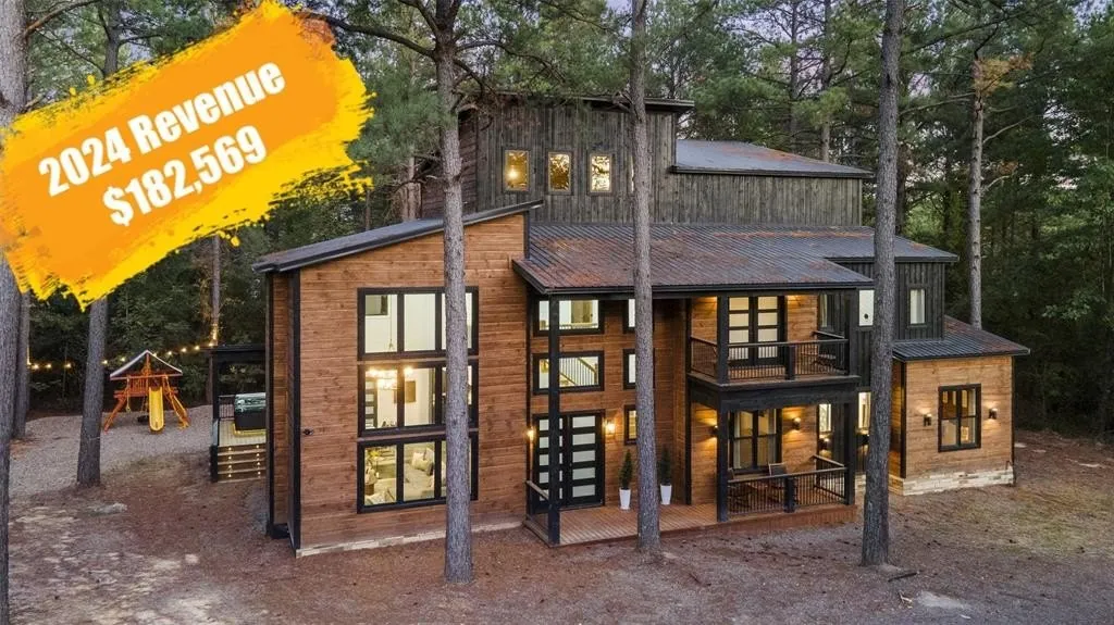 Experience the charm of this tri-level cabin that promises an unforgettable stay for up to 23 guests. The heart of the cabin is found on the first floor, featuring a fully equipped kitchen with stainless steel appliances and an elongated island with extra seating. A custom built in wine rack is a great place to keep wine on hand while making a statement. Cathedral ceilings with plenty of natural light that envelopes the dining area and living room through the large windows. Let the warmth of the remote-controlled fireplace embrace you while you relax in the contemporary living room. The laundry room features 2 stacked washers and dryers for convenience. The first floor also sets the stage for endless fun, boasting a game room with a ping pong table, a multi-game arcade, and shuffleboard – perfect for family game night! For those in search of tranquility, the first floor also offers three bedrooms. Each room is furnished with king-sized beds and spacious ensuite bathrooms for a rejuvenating stay. Ascend to the second floor to discover the first bunk room, equipped with a triple bunk (3 twin beds) and two additional king bedrooms with private balconies. Entertainment awaits with a basketball shooting game, electronic games, board games, and a TV sitting area. Another staircase leads to the second bunk room on the third floor, featuring five bunk beds (10 twin beds!) and its own TV sitting area. After a day filled with excitement, unwind in the hot tub on the covered deck or catch the game on TV while staying warm with the outdoor fireplace. This grand luxury cabin is nestled among towering pines, complemented by a fire pit for roasting marshmallows and creating s'mores. Picture the captivating tales spun under the starry night sky around the crackling blaze! Located just minutes from Hochatown and Beavers Bend State Park, your adventure aawaits. Reach out to listing agent for video tour!