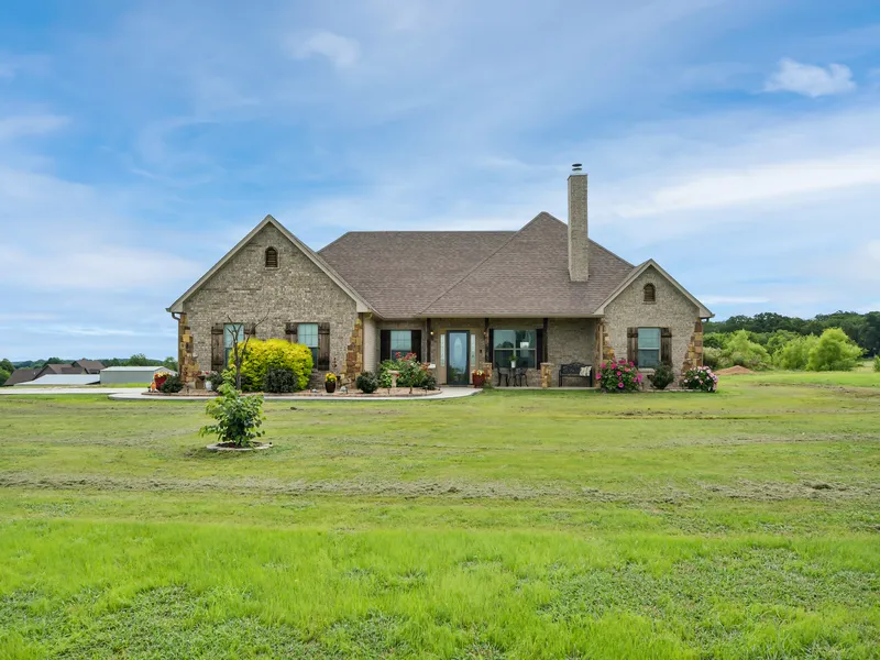 Welcome to your small-scale homesteading dream in the sought-after Thousand Oaks addition in Lone Grove, OK! This beautifully maintained custom-built home, completed in 2017, offers 1,817 square feet of comfortable living with 3 bedrooms, 2 bathrooms, and a versatile bonus office space at the front of the house. Designed with a warm rock and stone exterior and accented by charming shutters, the home sits on a spacious lot ideal for a hobby farm, complete with room for animals and a large garden.
