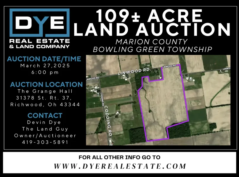 109 +/- acres located in Marion County Ohio, Bowling Green Township. This farm is approximately 6 miles east of Mt. Victory and 2 miles southwest of La Rue Ohio. Consisting of primarily all tillable land, this 109 acres is a great investment opportunity and would make a fantastic addition to your land holding portfolio. The soil types consist primarily of Blount and Pewamo. Dont miss this opportunity to come and bid your price on this great central Ohio land offering.
