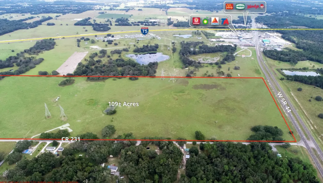 PROPERTY DESCRIPTION The land site contains around 1,326 feet of frontage and is 109 acres, situated on State Road 44. With the site directly located in Central Florida, it makes for easy highway transportation to major cities such as Orlando (48 miles away) and Tampa (75 miles away). The site is zoned for heavy commercial, and is intended to serve as office, commercial or industrial uses.