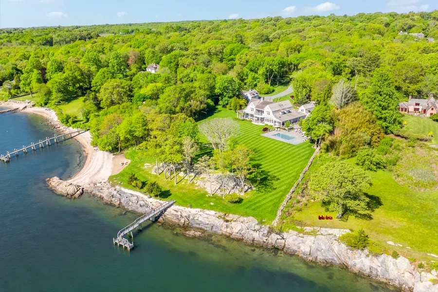 Rarely do you find properties like this come on the market. Offering coastal lifestyle perfection in this 9 acre estate on Narragansett Bay. Privacy abounds with a 1000' stone drive, 300' of waterfront access, stunning views, a secluded beach and a deep-water dock with power and water. The masterfully crafted 2019 Nantucket style home offers 6000 sq ft of unparalleled and refined open concept elegance including 11.5 ft ceilings, a gourmet kitchen with custom cabinetry, large marble island, ample seating, a wet bar, walk in pantry, prep kitchen/laundry room and a dining room. The large living room with fireplace, office/library and primary suite with a luxurious bath and California closet are also found on the first floor. Three additional ensuites and a family room with a spacious deck overlooking the grounds and water are located on the second floor. Additionally, private guest quarters can be found over the attached garage. A 20x40' gunite pool with automatic cover, 1500' of blue stone patio, an outdoor kitchen and a gas fire pit are an entertainer's dream. The separate garage has heat and A/C and may house an additional 5 cars, more with added lifts. Steel frame construction, whole house generator, underground utilities and security enhancements throughout are added features. An estate designed for those seeking the very best.