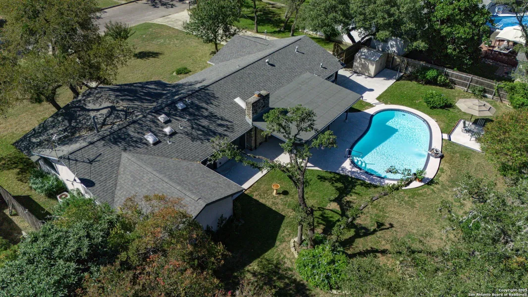 Charming south-facing 3 bedroom plus study, 2 bath rambler beautifully situated on a beautiful .41 acre lot with sparkling inground saltwater pool and doublewide drive with triple parking and a pass through gate for golf cart/trailer/jet ski located in the coveted community of Hollywood Park, TX just inside San Antonio's Loop 1604 along Highway 281. This appealing single story boasts two living areas - a bright and spacious 25' living and dining room perfect for Thanksgiving dinners and get togethers with friends and a warm family room overlooking the pool with french doors and rustic stone fireplace. A primary suite with outside access to the pool from both the bedroom and the primary bath, separate vanities and makeup area and an adjoining study/home office with shelving and multiple closets. The office could also transition to a beautiful nursery or exercise room or could be converted back to a 4th bedroom. Large windows and skylights offer natural lighting throughout the home. The secondary bedrooms are a roomy 12' X 12'. Just off the utility room is an 11' X 7' bonus area with desk for bill pay that would make a great mud room conversion. The kitchen offers light colored cabinetry, Bosch dishwasher, an insinkerator instant hot water unit and a unique breakfast area with wrap around windows providing a wonderful view of the private landscaped yard and inviting pool. Offering a perfect way to beat the Texas heat, the pool ranges in depth from approximately 3 feet to 6.5 feet. The back covered patio is ideal for outdoor entertaining with extended flatwork for BBQs and game nights. Three sheds provide plenty of storage options and a potting shed for the at-home gardener. The home was rewired with copper wiring, radiant barrier was added to the attic for energy efficiency and all windows in the home and garage were replaced with custom storm windows. One 1.5 ton condenser, matching evaporator coil and furnace was installed in Aug 2024, a 30 year multi-dimensional shingle roof installed in 2020 and 40 gallon hot water heater in December 2017. The primary bedroom and the two baths offer sound proofing walls. Other features include a workbench and built in storage in the large 2 car garage, water softener, rain gutters with Leafguard, quarterly pest control for years, & an American Home Shield home warranty. Hollywood Park offers highly sought after schools, spacious lots, a much loved white tail deer population, volunteer fire department, its own city police and an ideal location 15 minutes from the SA International Airport, 6 minutes to hospitals and medical offices, shopping and dining. Hollywood Park is a friendly community with much anticipated community events including Santa visits, July 4th parade and picnic, Easter egg hunts, chilli cookoffs, arts and craft fairs, etc. A resort style park with state of the art event venue, multiple pools, splash pad, tennis, basketball, volleyball, a pavilion, and access to the Sonterra Golf Course is arguably the best neighborhood amenity offering in north SA. Residents enjoy riding golf carts through the community to visit neighbors or spot newborn fawns. 109 Cueva Ln is a perfect place to create lasting memories. Come Home!