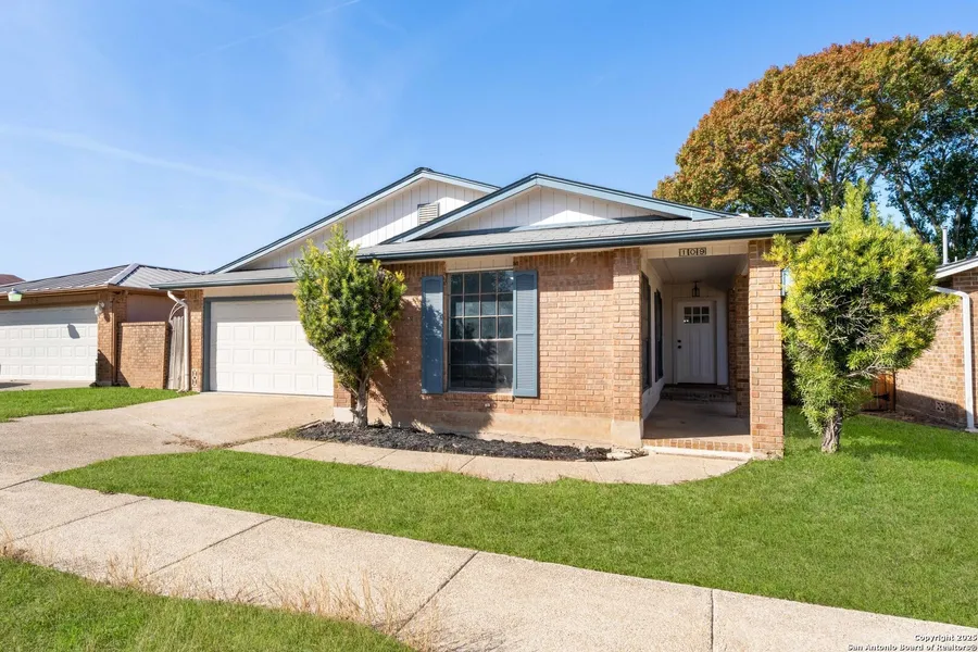 Rare opportunity! Welcome to this beautifully updated 3-bedroom, 2-bath home featuring an oversized 2-car garage, ideally positioned on a zero-lot-line property that backs to a serene greenbelt. High ceilings and a spacious open-concept floor plan create a bright, inviting atmosphere and provide a perfect canvas to make this home your own. The open kitchen flows effortlessly into the living area, where a cozy wood-burning fireplace and abundant natural light set the stage for comfortable everyday living and entertaining. A split-bedroom layout offers enhanced privacy, with a generously sized primary suite and two secondary bedrooms ideal for family, guests, or a home office. Step outside to the covered deck, perfect for relaxing or hosting gatherings while enjoying peaceful greenbelt views. Conveniently located just minutes from Randolph AFB and a nearby community park, this home combines comfort, privacy, and an excellent location.